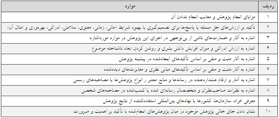 باید تشریح شود که انجام این پژوهش چه مزایای دارد و انجام ندادن آن، چه معایب و مشکلاتی خواهد داشت. در این بخش هم باید از پشتیبانی مبانی نظری در استدلال های ارائه شده استفاده کرد. ساختار نگارش اهمیت و ضرورت می تواند بر اساس محورهایی به شرح جدول فوق مورد توجه قرار گیرد.