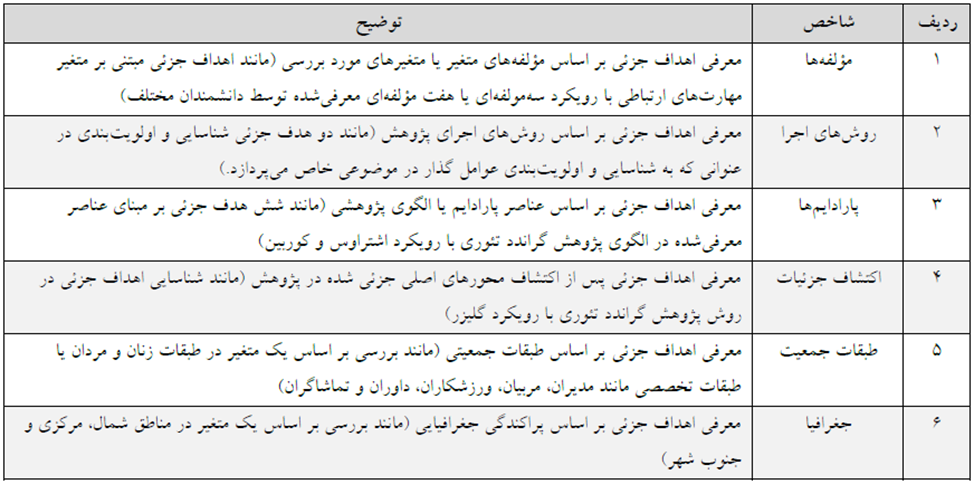 هدف پژوهش مشخص کننده آن است که پژوهشگر به دنبال چیست! بسیاری از داوران ابتدا اهداف کلی و اختصاصی را می خوانند و بر اساس آن بقیه اجزای پروپوزال را از نظر قابل اجرا بودن مورد بررسی قرار می دهند. هدف کلی اغلب همان عنوان پژوهش و در مواردی با توضیحات بیشتر است. پژوهشگر بر اساس موضوع نسبت به تدوین هدف کلی و اهداف جزئی اقدام می کند. هدف کلی از موضوع گرفته می شود و اهداف جزئی از هدف کلی اخذ می شود. اهداف اختصاصی شامل چندین هدف است که هر کدام بخشی از هدف کلی را پوشش می دهد. به همین خاطر به آن اهداف «جزئی، فرعی، اختصاصی یا ویژه» هم می گویند. برای جزئی کردن یک هدف کلی می توان از شاخص هایی به شرح جدول زیر استفاده کرد.
