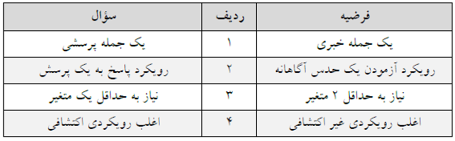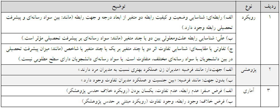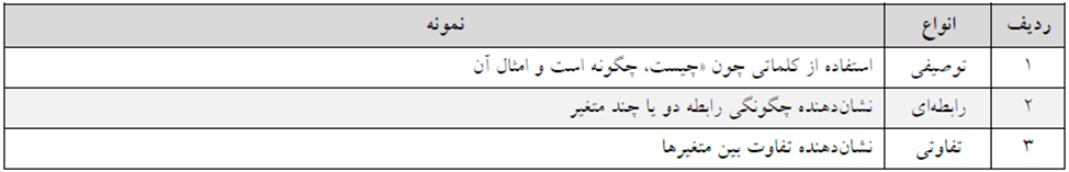 سوالات پژوهش را می توان به سه دسته «توصیفی، رابطه ای و تفاوتی» به شرح جدول زیر تقسیم کرد.