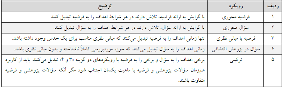 حال این سوال مطرح می شود که چه موقع از سوال و چه موقع از فرضیه باید استفاده کرد؟ پاسخ به این سوال اغلب با اختلاف نظرهایی بین اساتید و محققان مختلف روبرو است و می توان انواع رویکردها و نظرات را در این رابطه در جدول زیر مشاهده کرد.