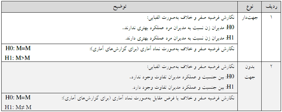 در فرضیه جهت دار، جهت متغیر مستقل بر متغیر وابسته مشخص است ولی در فرضیه بدون جهت، جهت متغیر مستقلق بر متغیر وابسته مشخص نیست. فرض های صفر و خلاف را می توان برای فرضیه های جهت دار و بدون جهت به دو شکل الفبایی و نماد آماری به شرح جدول زیر نوشت.