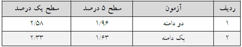 فرضیه های جهت دار «فرضیه های یک دامنه» و فرضیه های بدون جهت «فرضیه های دو داممنه» هستند. شناسایی «جهت دار یا بدون جهت» بودن فرضیه برای آزمون آماری مهم است. اندازه شاخص آزمون مورد نظر برای رد فرض صفر با مقدار آلفا 5 درصد برای آزمون دو دامنه به میزان 1.96 و برای آزمون یک دامنه به میزان 1.63 است. همچنین اندازه شاخص آزمون مورد نظر برای رد فرض صفر با مقدار آلفا 1 درصد در آزمون دو دامنهع به میزان 2.58 و برای آزمون یک دامنه 2.33 است (جدول زیر).