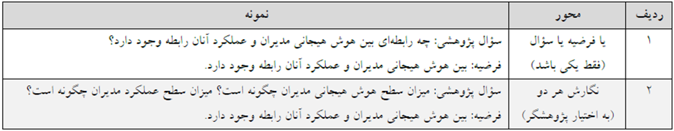 در نهایت انتخاب سوال یا فرضیه به نوع استدلال دانشجو و هدایت استاد راهنما بستگی دارد. باید دقت کرد که نوشتن هر دو شکل فرضیه و سوال برای دستیابی به یک نتیجه از یک هدف، مجاز نیست. پس لازم است فقط سوال یا فرضیه ای مشخص برای یک هدف اختصاصی نوشته شود. البته چنانچه ماهیت سوال پژوهشی و فرضیه متفاوت باشد نگارش هر دو مجاز است به شرط آن که تکرار و از لحاظ مفهومی یکسان نباشند. برای درک بیشتر به موارد جدول زیر و نمونه های ارائه شده توجه فرمایید.