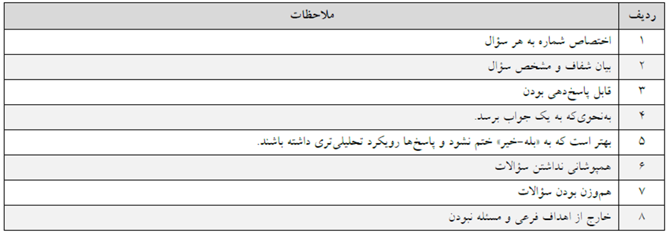 در نوشتن سوالات پژوهش باید به مواردی به شرح جدول زیر توجه داشت.