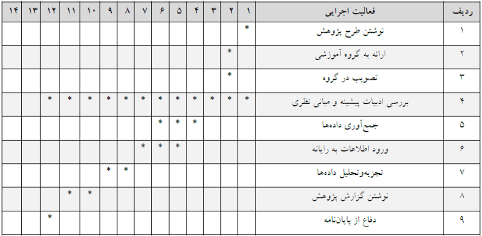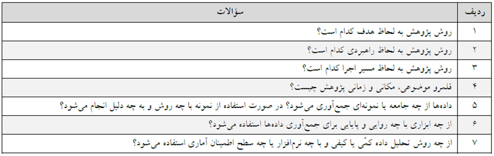 بعد از این که سوال یا فرضیه پژوهش مشخص شد، باید روش انجام تحقیق و چگونگی آزمون فرضیه ها یا پاسخ به سوالات در قالب روش ناسی تحقیق مشخص شود. به این منظور باید به سوالاتی به شرح جدول زیر پاسخ داد و آنها را در پروپوزال نوشت.