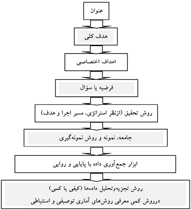 در روش شناسی یک ارتباط منطقی بین اجزای روش شناسی هر پژوهش وجود دارد، به این معنا که هر یک از اجزاء با یک ربط منطقی بر اساس جزء قبل از خود شکل می گیرد. در واقع نقطه شروع برای نوشتن روش شناسی، ابتدا عنوان و بعد اهداف و در ادامه فرضیه یا سوالات پژوهشی است. بر اساس این موارد ابتدا روش پژوهش، سپس جامعه، نمونه و روش تعیین آن، سپس ابزار جمع آوری داده ها، روایی و پایایی آن و در نهایت روش های تجریه و تحلیل یافته ها مطرح می شود. این فرایند در شکل زیر معرفی شده است. توصیه می شود، به جای نظرگیری درباره یک عنوان خالی، ابتدا در کنار این شکل اجزای کار معرفی شود و بعد از اساتید و مشاوران مختلف برای اصلاح و تکمیل آن نظر بگیرند. شکل زیر به نوعی راهنمای نگارش پروپوزال خام اولیه و شروع بسیار خوبی برای تکمیل و نگارش پروپوزال اصلی است.