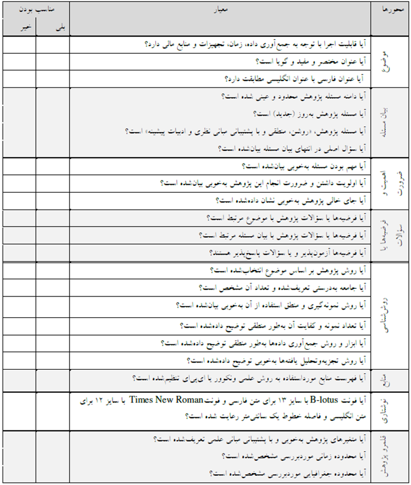 در نهایت پروپوزال تکمیل شده توسط دانشجو یا داوران بر اساس محورهایی به شرح جدول زیر قابل ارزیابی است.