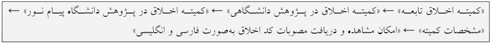 برخی پژوهش ها و به دلیل کار روی موضوعات انسانی و حیوانی، ملزم به دریافت «کد اخلاق» هستند. برای نمونه با توجه به تاکید کمیته ملی اخلاق در پژوهش های زیست پزشکی و آیین نامه کمیته اخلاق زیستی دانشگاه پیام نور کلیه پژوهشگران به خصوص در رشته روانشناسی با موضوعات انسانی و حیوانی باید پس از تایید عنوان پروپوزال، مصوبه کمیته اخلاق زیستی یا کد اخلاق را دریافت کنند. به این منظور پژوهشگران با تکمیل فرم رضایت نامه آگاهانه پژوهش آن را همراه با مصوبه پروپوزال و فایل پروپوزال به مسئول پژوهشی مرکز تحویل داده تا به کمیته اخلاق در پژوهش دانشگاه به نشانی re_research_office@pnu.ac.ir در دفتر تحقیقات، خدمات پژوهشی و فناوری ارسال شود. در ادامه و برای مشاهده مصوبات کمیته اخلاق در پژوهش در خصوص اخذ کد اخلاق، باید به سامانه ملی اخلاق در پژوهش های زیست پزشکی وزارت بهداشت، درمان و آموزش پزشکی، به نشانی ethics.research.ac.ir مراجعه و از مسیر شکل زیر کد اخلاقی را دریافت کرد. فرم رضایت و آیین نامه کمیته اخلاق زیستی دانشگاه پیام نور در پورتال مرکزی و قسمت پژوهش قابل دسترسی است.